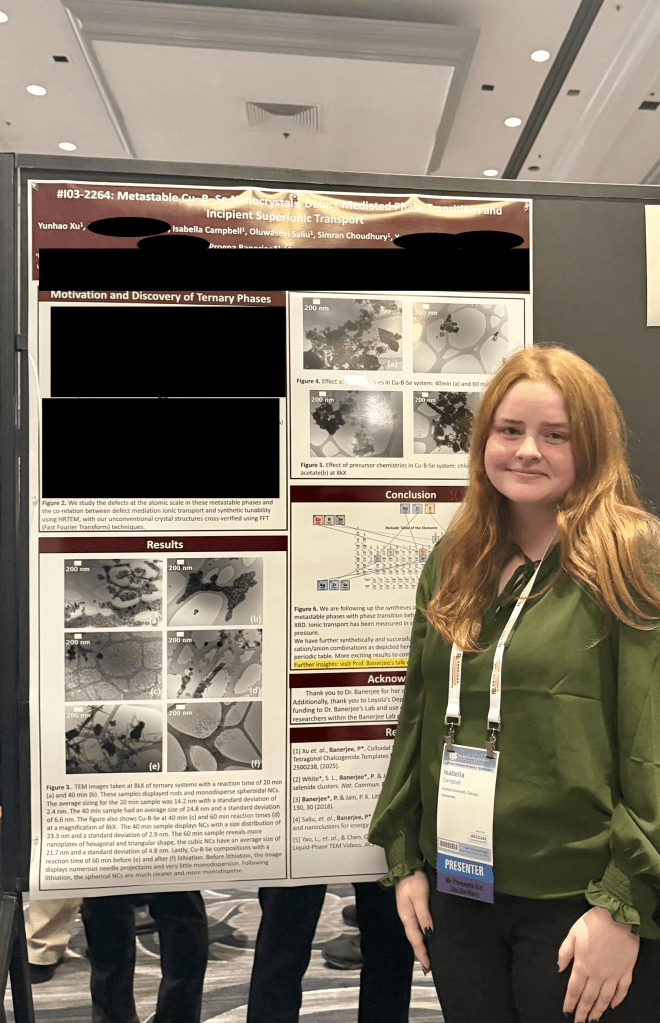 September 2025[AIChE Conference]: Prof. Banerjee participated in the 7th AIChE (American Institute of Chemical Engineers) Battery and Energy Storage Conference at Argonne National Laboratory September 2025[New members]: We welcome five new students to the group! August 2025[Research Support Grant]: PBEnergyLab received Research Support Grant Competition Award for project “ Advanced Structural and Compositional Characterization of Colloidal Copper Boron Selenide Nanocrystals for Superionic Conductors.” July 2025[New Publication]: PBEnergyLab’s second manuscript is published in Nano Energy (Journal CiteScore of 30.4)! Congrats to all student and postdoc co-authors! https://www.sciencedirect.com/science/article/abs/pii/S2211285525007104 We performed a comprehensive review on aspects of charge (both electronic and ionic) transport in functional ligand capped nanocrystals and nanoclusters for energy applications. July 2025[Farewell to lab member]: PBEnergyLab bids farewell to Yunhao Xu who graduated with a BS/MS dual degree! In his time with our lab he has synthesized several libraries of complex chalcogenide nanocrystals spanning various new compositions, metastable crystal phases and stabilized in peculiar morphologies. Our lab will be busy for a while in studying these compounds for energy applications with various advanced material and electrochemical techniques that we are currently setting up in our lab and beyond! We wish Yunhao the best in his next chapter with med school! June 2025[Synchrotron visit]: PBEnergyLab members visited Argonne’s newly upgraded APS synchrotron as a participant in the CCP4/APS School in Macromolecular Crystallography 2025 workshop to obtain some insights into data collection using macromolecular beamline setup on our lab’s samples. June 2025[New Publication]: PBEnergyLab’s first manuscript is published in Small Structures (Journal CiteScore of 19.4)! Congrats to all student and postdoc co-authors! https://onlinelibrary.wiley.com/doi/10.1002/sstr.202500238 April 2025[Awards]: Three students from PBEnergyLab received competitive fellowships or national recognition! Congratulations to Simran and Isabella for their 2025-26 Mulcahy and 2025 Provost fellowships, and to Yunhao for his The American Institute of Chemists 2025 Student Award! April 2025[New Manuscript]: Our group submitted the first manuscript since inception on the synthesis of CuBSe2 as precursor templates for lithiated versions, for use as potential superionic conducting materials in Li-ion batteries! Congrats to all lab members who worked on this study! March 2025[Invited Talk]: Prof. Banerjee gave an invited talk at the Solid State and Structural Chemistry Unit, Indian Institute of Science-Bengaluru. More information can be found here: https://sscu.iisc.ac.in/special-seminar-engineering-quantum-materials-for-enhanced-safety-and-performance-in-solid-battery-electrolytes/ Oct 2024[DOE Feature]: PBEnergyLab PI Prof. Banerjee’s entry to Argonne National Lab’s 2024 Art of Science using transmission electron microscopy image acquired while at Argonne on halide perovskite nanomaterials has been included in a mural exhibit in the Department of Energy building in Washington, D.C., outside the secretary’s office. See the mural below. Oct 2024[New Members]: PBEnergyLab welcomed a total of six new students! Welcome to the lab! Aug 2024[Launch]: Progna is excited to start her independent laboratory as a tenure-track professor at Loyola University Chicago this month! The “PBEnergyLab”, will be working on designing batteries to be non-combustible, cost-effective, efficient: and built with elements sustainably sourced within the US. We will be actively researching the discovery and development of new battery chemistries to realize this significant and timely solution to the current crisis faced by the U.S. domestic energy sector. Aug 2024: Progna completed her postdoctoral training at the Argonne National Laboratory with Dr. Elena Shevchenko earlier this month. As a core-postdoc at the Center for Nanoscale Materials, she led projects on a broad range of synthesis-driven discovery initiatives looking for unconventional phases in nanostructured inorganic energy materials: to design and develop efficient and non-combustible battery chemistries. She coupled these synthetic initiatives with detailed mechanistic studies of structural transformations in material classes spanning chalcogenides, perovskites, MXenes and hybrid organic/inorganic systems using Argonne’s Advanced Photon Source beamlines. She is grateful to train and consistently utilize various electron microscopy tools, and many other instruments while at Argonne. There are many mentors and collaborators Progna is grateful to throughout her academic training, spanning five university degrees in five areas of the physical sciences: and two continents, and in my research career at U.S. Department of Energy (DOE) National Laboratories. Of particular mention is her PhD advisor Prashant Jain at the University of Illinois Urbana-Champaign who helped her transform from a Department of Physics University of Illinois Urbana-Champaign student into a chemistry researcher. May 2024: Progna’s latest first-author article from her postdoc work at Center for Nanoscale Materials at Argonne National Laboratory discusses the discovery of a new phase at high pressures in model solid electrolyte nanomaterials. Using the atomic level tailoring method called “cation exchange”, faceted nanocrystals and 2D nanoplatelets of copper selenides were synthesized through wet colloidal techniques. Next, the GSECARS high pressure beamline at Advanced Photon Source was utilized to squeeze these materials using a diamond anvil cell, and obtain x-ray diffraction patterns at various pressures (GPa range). Phase transitions were observed from the zinc blende to a CsCl-type structure above 4 GPa. These results are important for the design of energy materials for high s