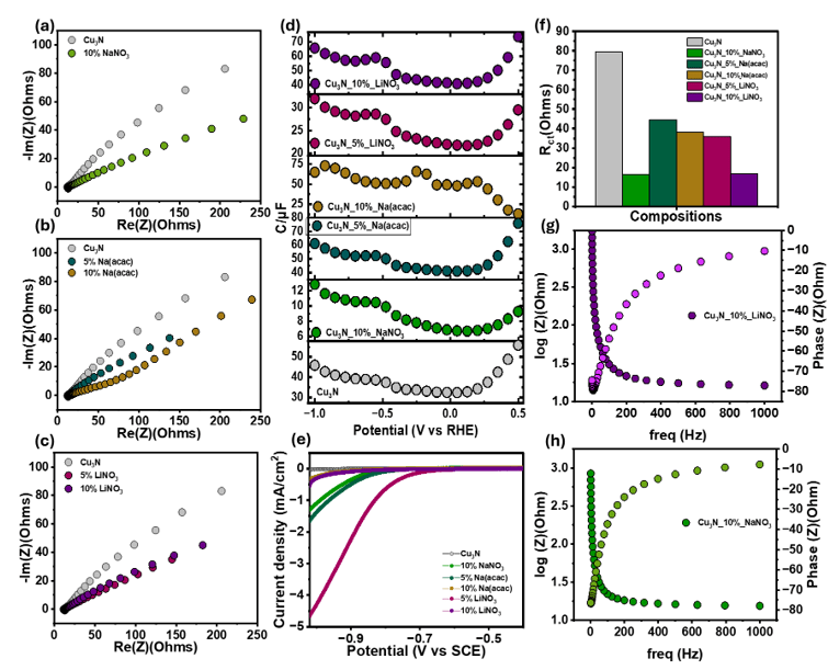 | 24. Lattice Alkali in Cu₃N Reprograms Interfacial Electronics for Selective Aqueous Nitrate-to-Ammonia, Saliu, O., Cooper, O., Banerjee, P.* (Corresponding author), in review, 2025. Current Preprint DOI: 10.26434/chemrxiv-2026-k2dn5 Note on versions: This preprint supersedes our earlier data-rich preprint focused on Na-electrolyte experiments (10.26434/chemrxiv-2025-3zqxg). This previous version will not be submitted for peer review. Please cite the current preprint. One-line summary: We encode interfacial electrostatics in Cu₃N nanocrystal films via Na lattice modification and Li-induced amorphization, to shift PZC/Cdl, lower Rct, and increase NH₃ selectivity and rates in NO₃RR. | ![]() Reproduced from our preprint “Lattice Alkali in Cu₃N Reprograms …” (DOI: 10.26434/chemrxiv-2026-k2dn5). License: CC BY NC ND 4.0 (authors retain copyright). No publisher formatting. |